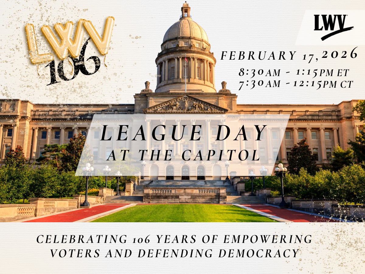 LWV of Kentucky works to promote political responsibility through informed and active participation of Kentuckians in government. We may take action on government measures and policies in the public interest in conformity with the principles of the League of Women Voters of the US. We do not support or oppose any political party or candidate.