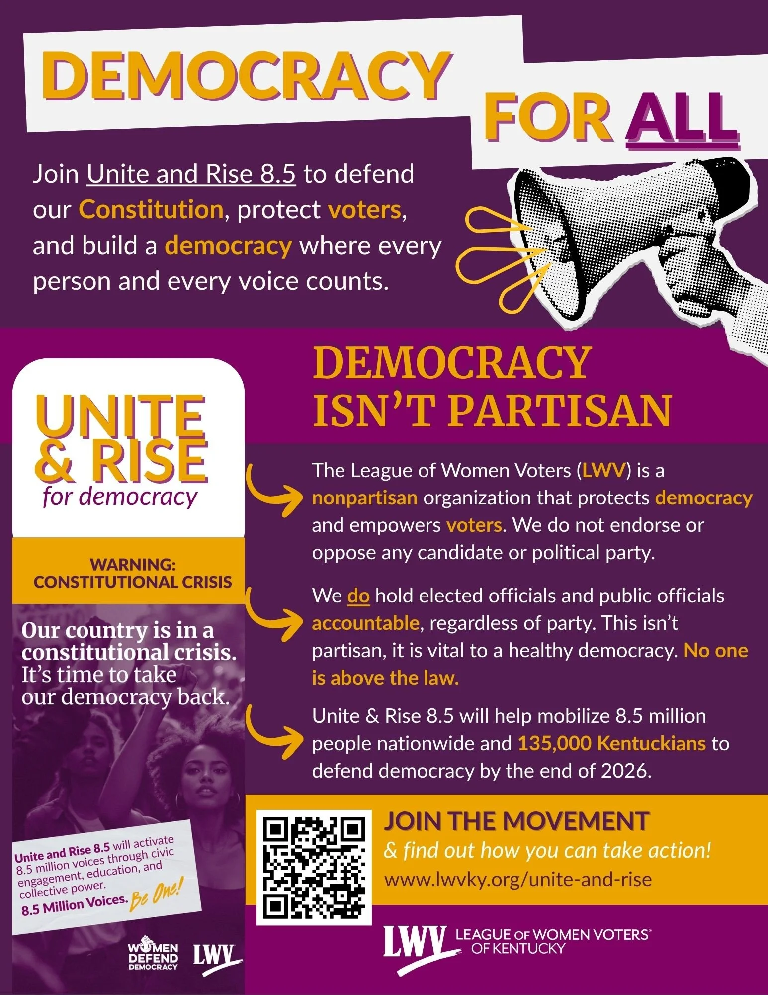 Join Unite and Rise 8.5 to defend our Constitution, protect voters, and build a democracy where every person and every voice counts. Unite & Rise 8.5 will help mobilize 8.5 million people nationwide and 135,000 Kentuckians to defend democracy by the end of 2026.