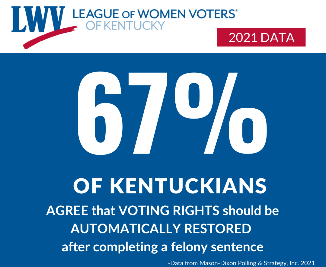The League of Women Voters of KY advocates for the restoration of voting rights for justice-involved Kentuckians who have a felony conviction. Kentucky is one of only 3 states that permanently bans people from voting after a felony conviction. KY’s Constitution takes the right to vote away from anyone with a felony. The only way to have the right to vote restored is to obtain a partial pardon from the governor or through an expungement of the felony. To permanently secure the voting rights of ALL justice-involved Kentuckians after completing their entire felony sentence, the Kentucky Constitution must be amended. The League of Women Voters of KY is advocating for the public to be able to voice their opinion on changing the KY Constitution by placing this issue on the ballot.